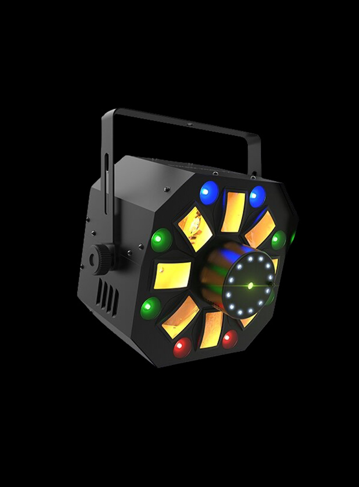 RGBAW rotating derby, RGB+UV wash, red/green laser, and a ring of white SMD strobes. Compatible with ILS